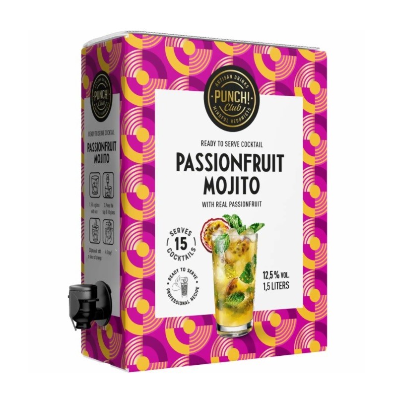 Punch Club Passionfruit Mojito 12,5% 150cl on pehmeä virolainen valmissekoitettu cocktail, jossa yhdistyy trooppinen passionhedelmä, raikas minttu ja rommin maku. Se tarjoaa makean, hedelmäisen ja pirskahtelevan profiilin, sopii tarjoiltavaksi jäähdytettynä juhlissa tai rentoissa tilaisuuksissa.