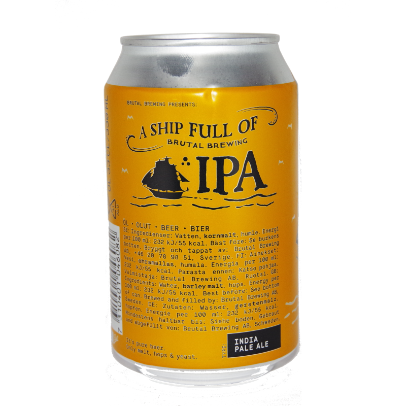 Brutal Brewing – A Ship Full of IPA 5,8% 24×33cl on ruotsalainen India Pale Ale, jolla on voimakas, moderni ja humalavetoinen luonne. 5,8% alkoholipitoisuus tuo esiin intensiiviset sitrus- ja trooppisten hedelmien aromit, pehmeän mallaspohjan ja raikkaan, miellyttävän katkeruuden. Erinomainen valinta IPA- ja craft-oluiden ystäville.