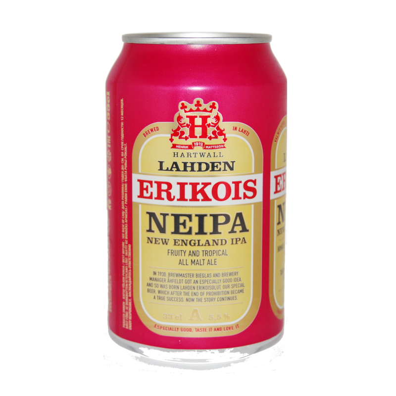 Hartwall Lahden Erikois NEIPA 5,5% 24×33cl on suomalainen New England IPA, samea, hedelmäinen ja aromaattinen. Valmistettu huolella valituista humalista, ja siinä on trooppisia hedelmiä, sitrusta ja pehmeä, mehumainen maltaisuus. Pehmeä, hieman samea ja helposti juotava IPA:n ystäville. Sopii arkeen, grilliruoan kanssa tai ystävien seurassa nautittavaksi.