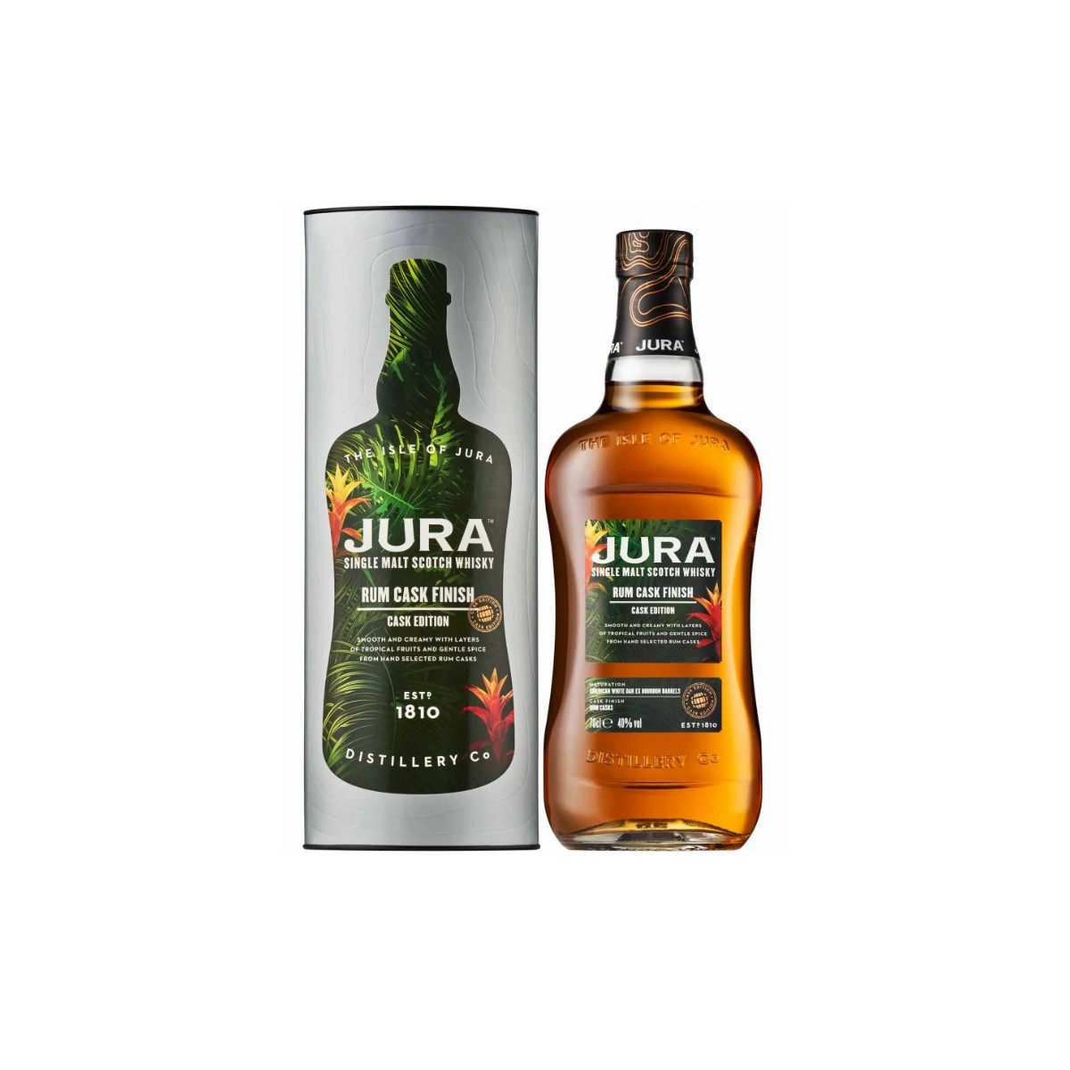 Smak: I gommen är Jura Rum Cask Finish len men full av smak. Noter av mogna tropiska frukter dominerar, som harmoniskt kombineras med de rika smakerna av rom - sötman av melass, delikat vanilj och kryddiga kryddor. Det finns också subtila ekaccenter som kommer från mognad på romfat. Whiskyns kropp är medium, med bra djup som förblir behaglig i gommen.